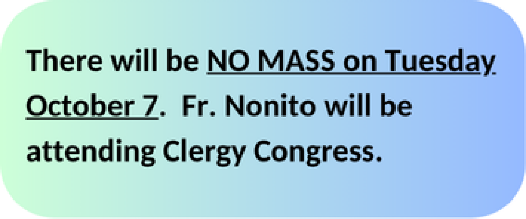 Please check the bulletin to confirm weekday Mass times as they are subject to change when Fr. Nonito is unavailable.