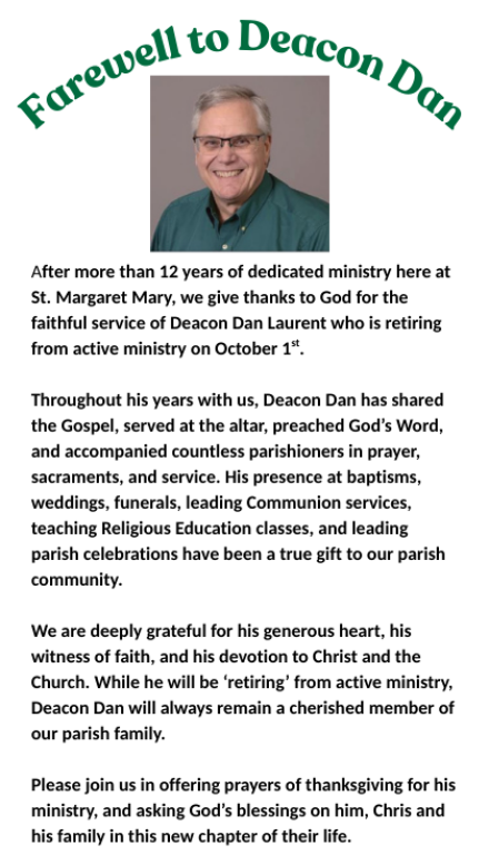 We the people of St. Margaret Mary Parish united in faith and prayer, resolve to give witness to the Gospel.