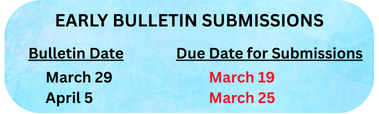 The bulletin goes to the printer every Tuesday. However, there are times when the printer will require us to send our bulletins earlier than our normal schedule due to holidays and office closings. When that occurs, we will send out a notice in the bulletin that lists the early submission due dates for items to be posted. We will also include that post on this page as well (see below).
