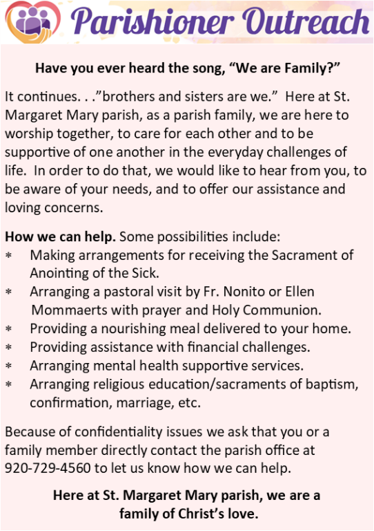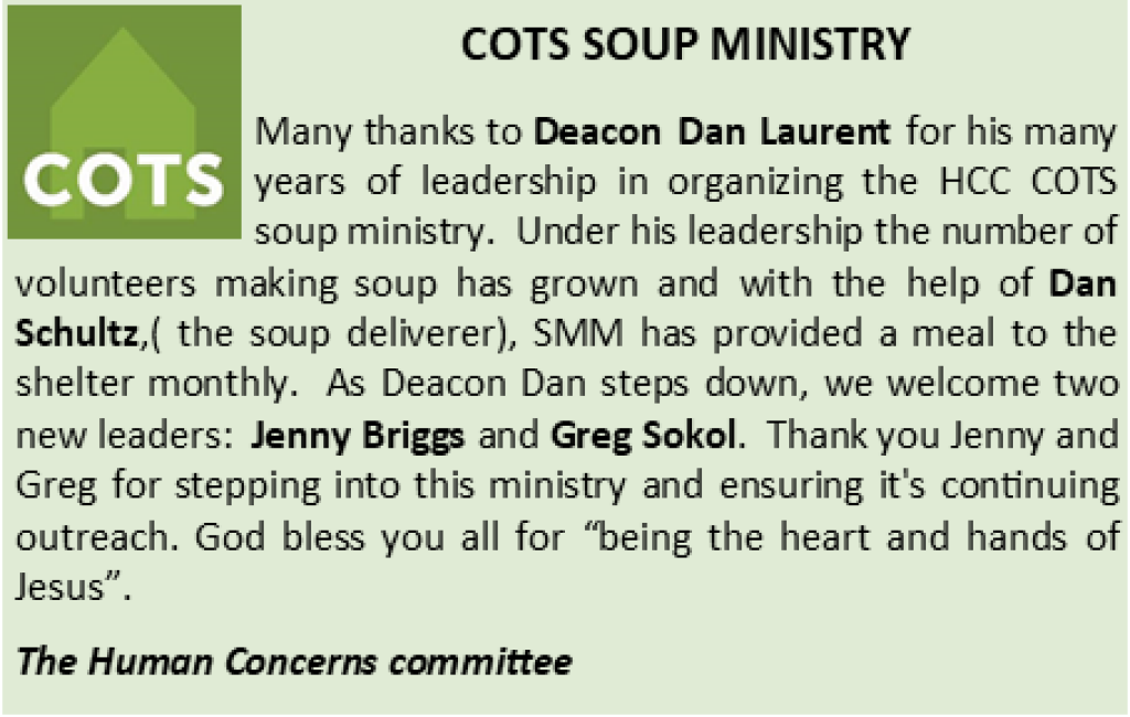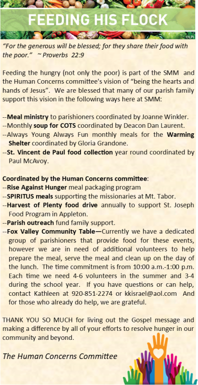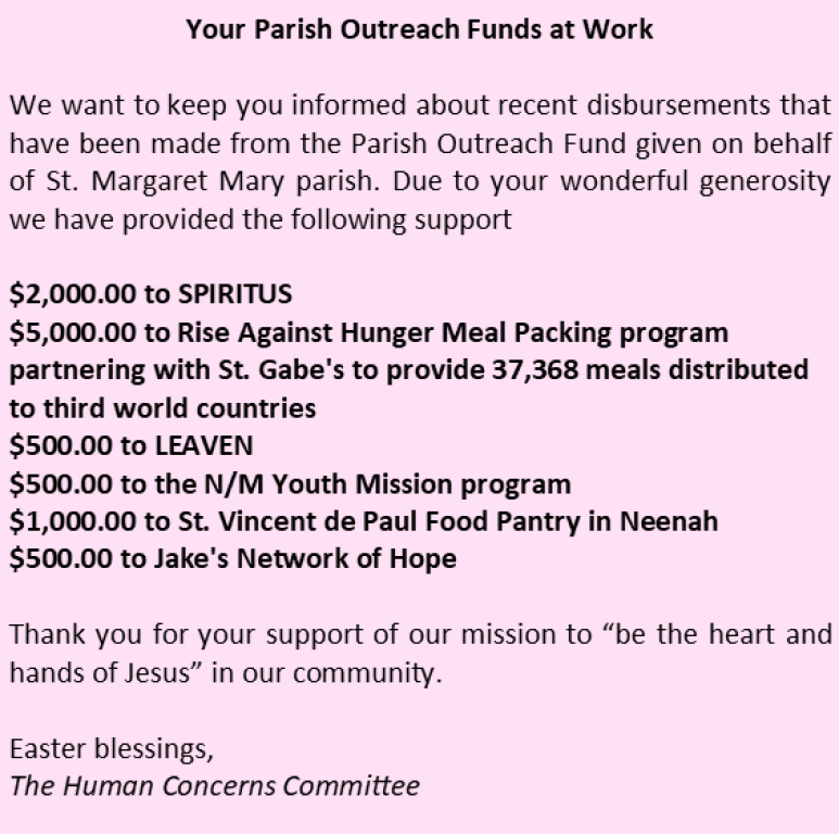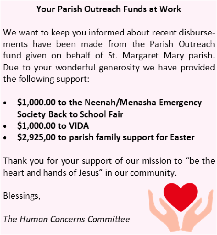 The St. Margaret Mary Human Concerns Committee is motivated by the call to practice our Christian Catholic faith by engaging in works of charity and by pursuing social justice.