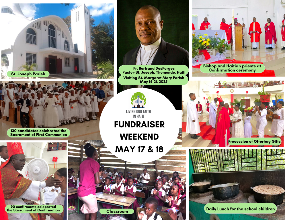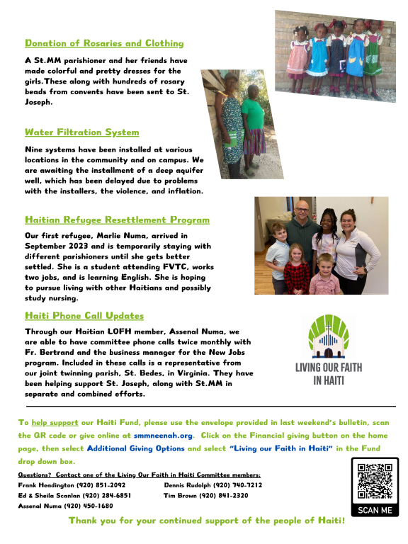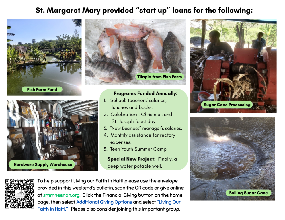 Please submit a check to St. Margaret Mary Parish at 439 Washington Ave., Neenah, WI 54956. Please make checks payable to St. Margaret Mary and note " Living our Faith in Haiti" in the memo line.