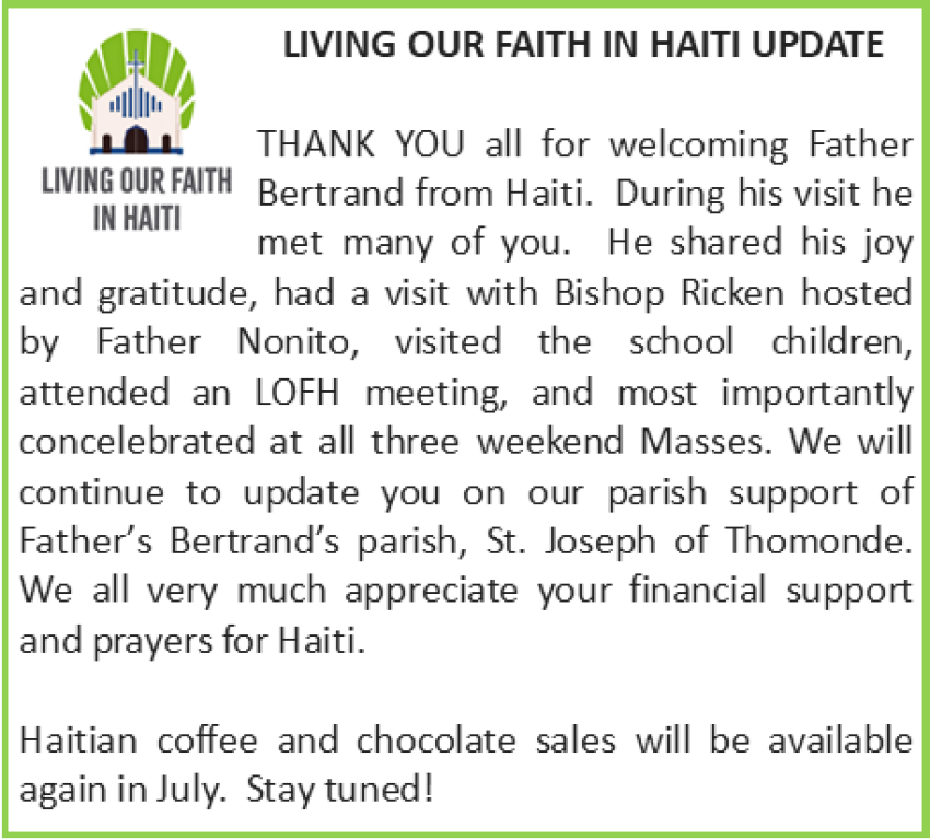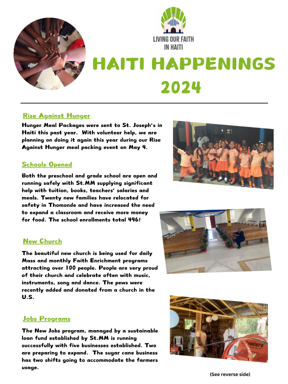As a subcommittee of Human Concerns, the mission of Living our Faith in Haiti is "to live the Gospel message through prayer, support, and service with the members of St. Joseph Parish in Thomonde, Haiti by sharing resources to enhance the faith, health, education and overall well-being of our Parish communities."