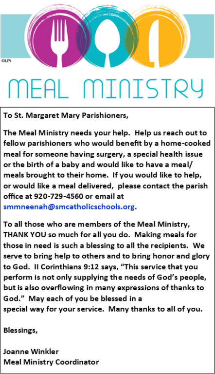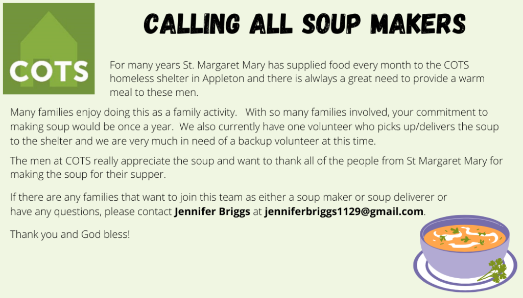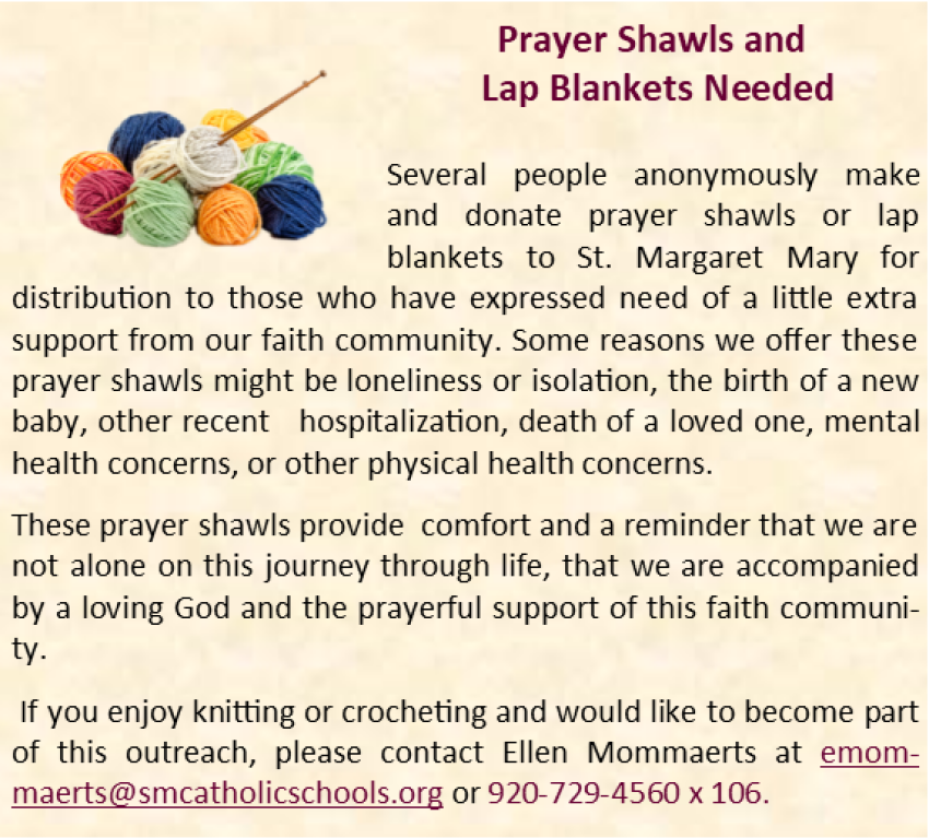 For more information or if you have any questions, please contact Beckett Mathews at the Parish Center (920) 729-4560 or bmathews@smcatholicschools.org.