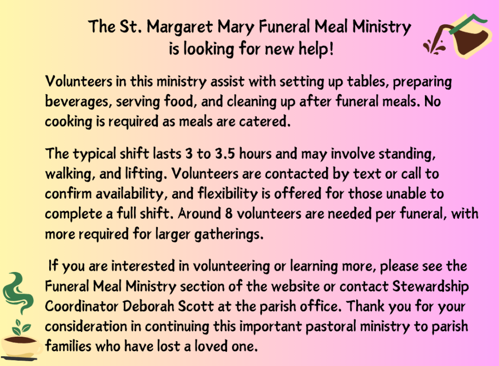 For a full list of committees, ministries and other groups in our parish that need volunteers, please CLICK HERE .