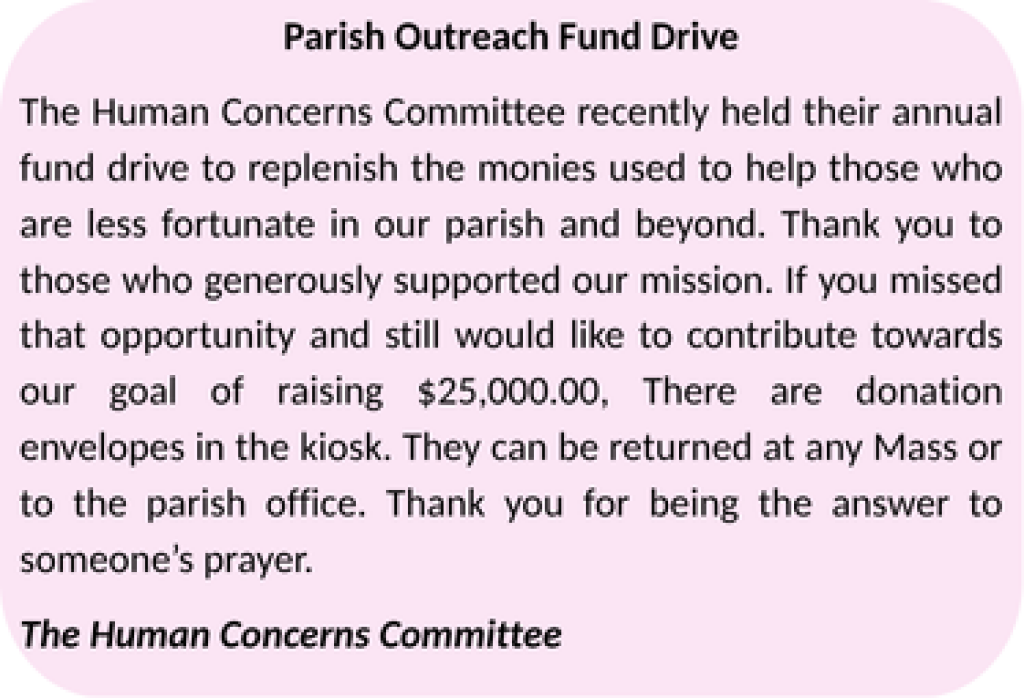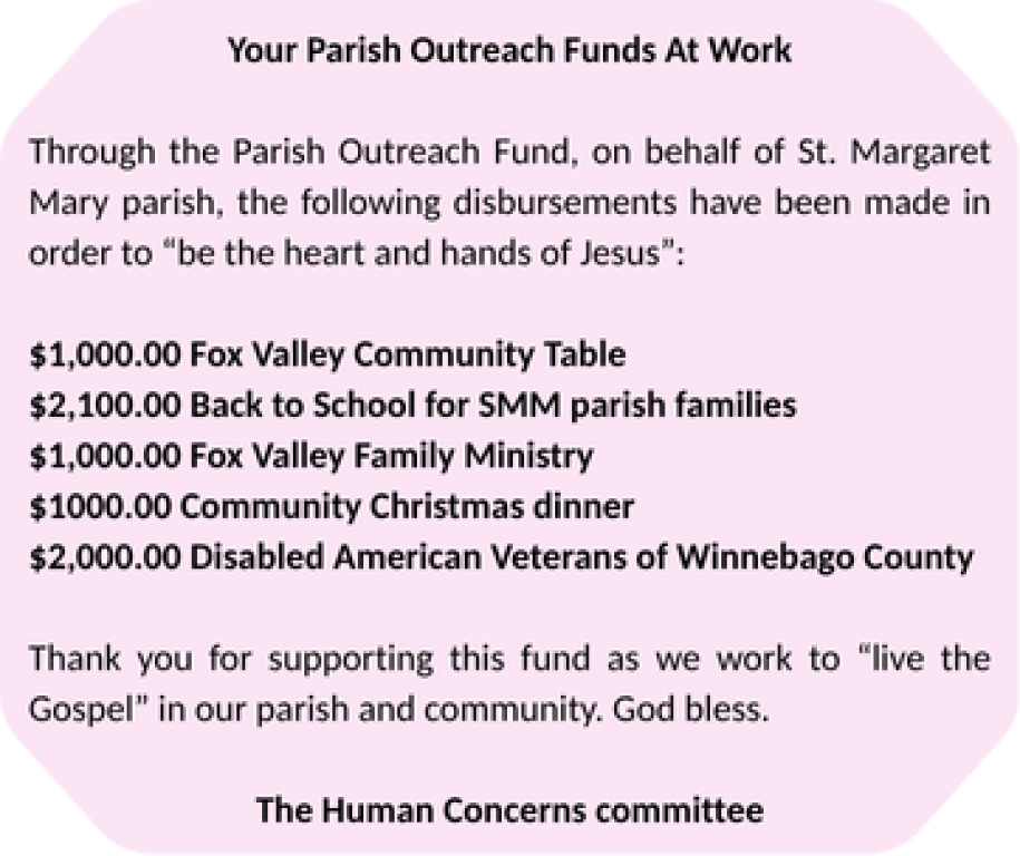 The St. Margaret Mary Human Concerns Committee is motivated by the call to practice our Christian Catholic faith by engaging in works of charity and by pursuing social justice.